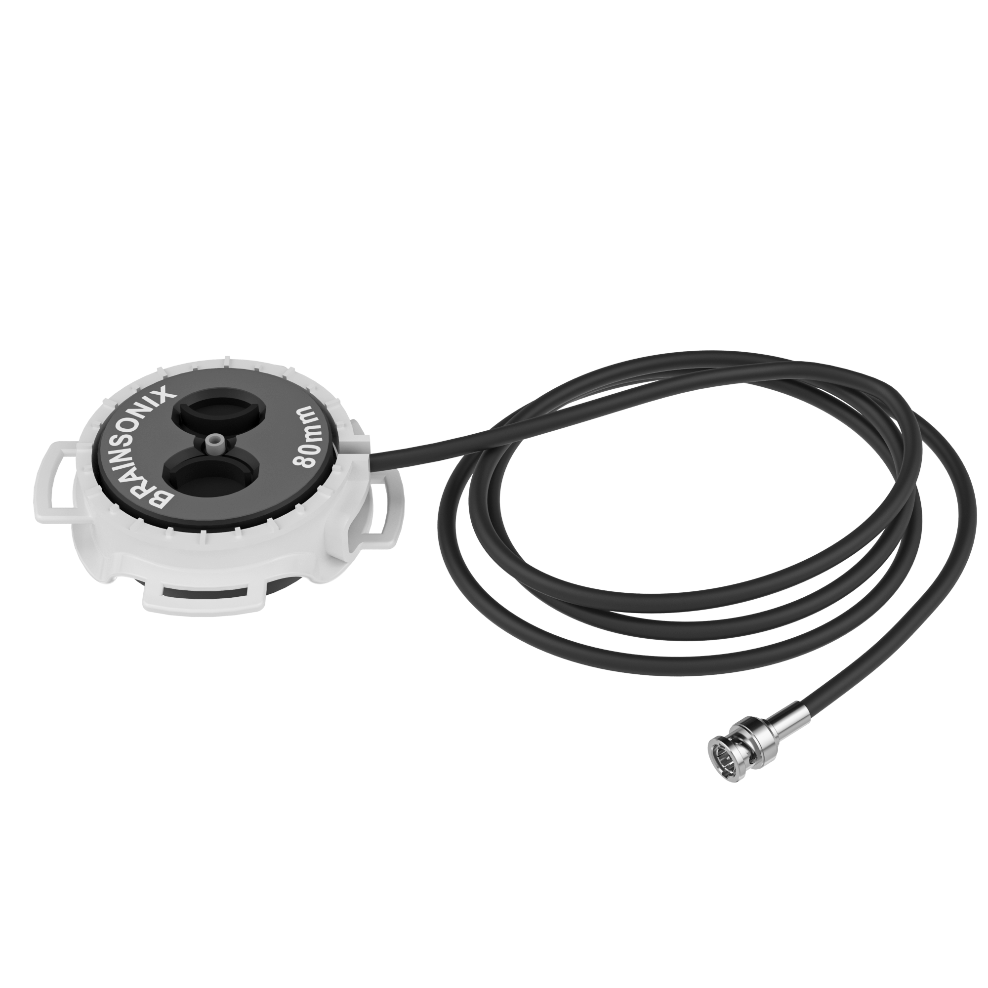 Our transducers are the critical components that convert electrical signals from the console into ultrasound waves and focus them into the brain. BrainSonix transducers are single-element, air-backed spherically focused ultrasound emitters. They have a 61 mm aperture diameter and are engineered to operate at our chosen ultrasound frequency (~650 kHz) with high efficiency. We offer transducers in multiple focal lengths – approximately 35 mm, 55 mm, 65 mm, and 80 mm – which correspond to the depth at which the ultrasound waves converge into a focus. By selecting a transducer with an appropriate focal length, users can target regions at different depths in the brain: shorter focal lengths for shallower targets (e.g. cortical areas or basal ganglia near the surface) and longer focal lengths for deep targets (e.g. thalamus, amygdala, hippocampus near the center of the brain). All transducers produce a tight focal zone on the order of only a few millimeters in size, enabling very specific targeting.